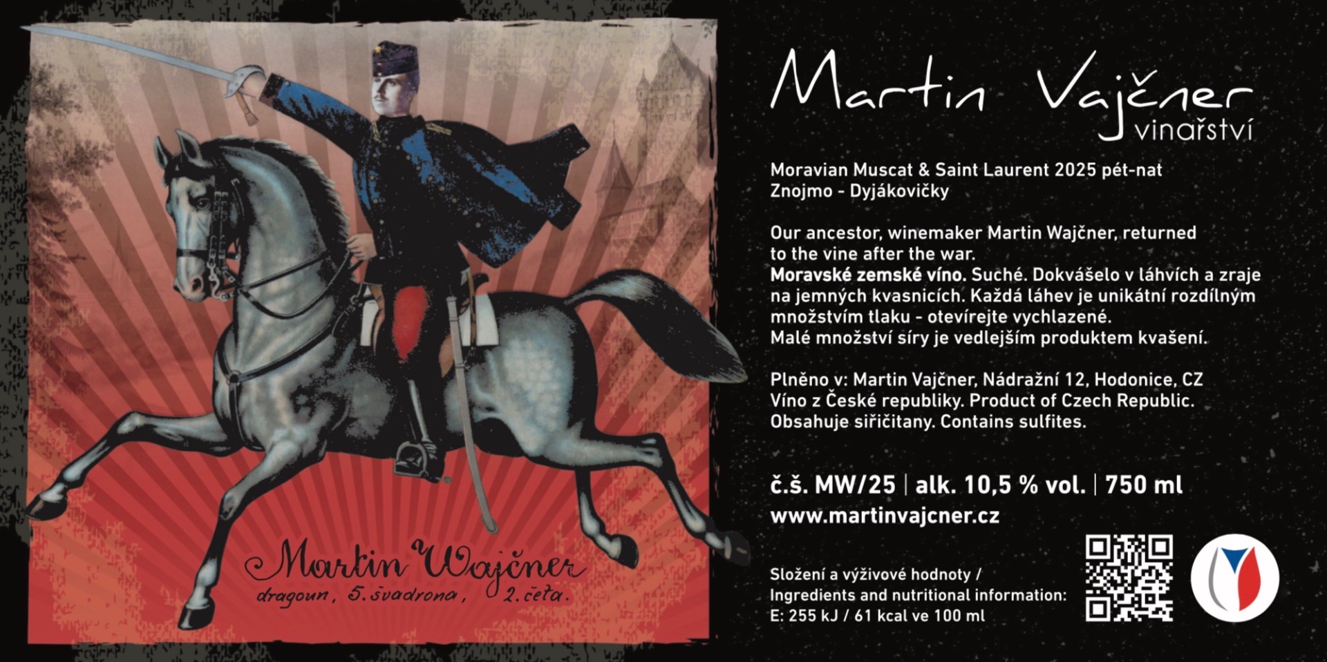 Toto víno vzdává hold mému předkovi, vinaři Martinu Wajčnerovi, který se po válce vrátil k vinné révě. Etiketa vychází z originálu dochovaného obrazu. Vyrobeno z hroznů odrůd Muškát Moravský a Svatovavřinecké. Viničních trať U Sklepů v Dyjákovičkách – podoblast Znojemská. Lisovány celé hrozny. Víno následně spontánně kvasilo ve skleněných demižonech. Při 8 g/l zbytkového cukru dokvášelo v láhvích. Zraje samostatně v láhvích na jemných kvasnicích. Víno jemně perlí a působí tak svěžím dojmem. Víno není čiřeno ani filtrováno. Bez přídavku síry. Ležením na láhvi bude získávat jemnější perlení a krémovější charakter.